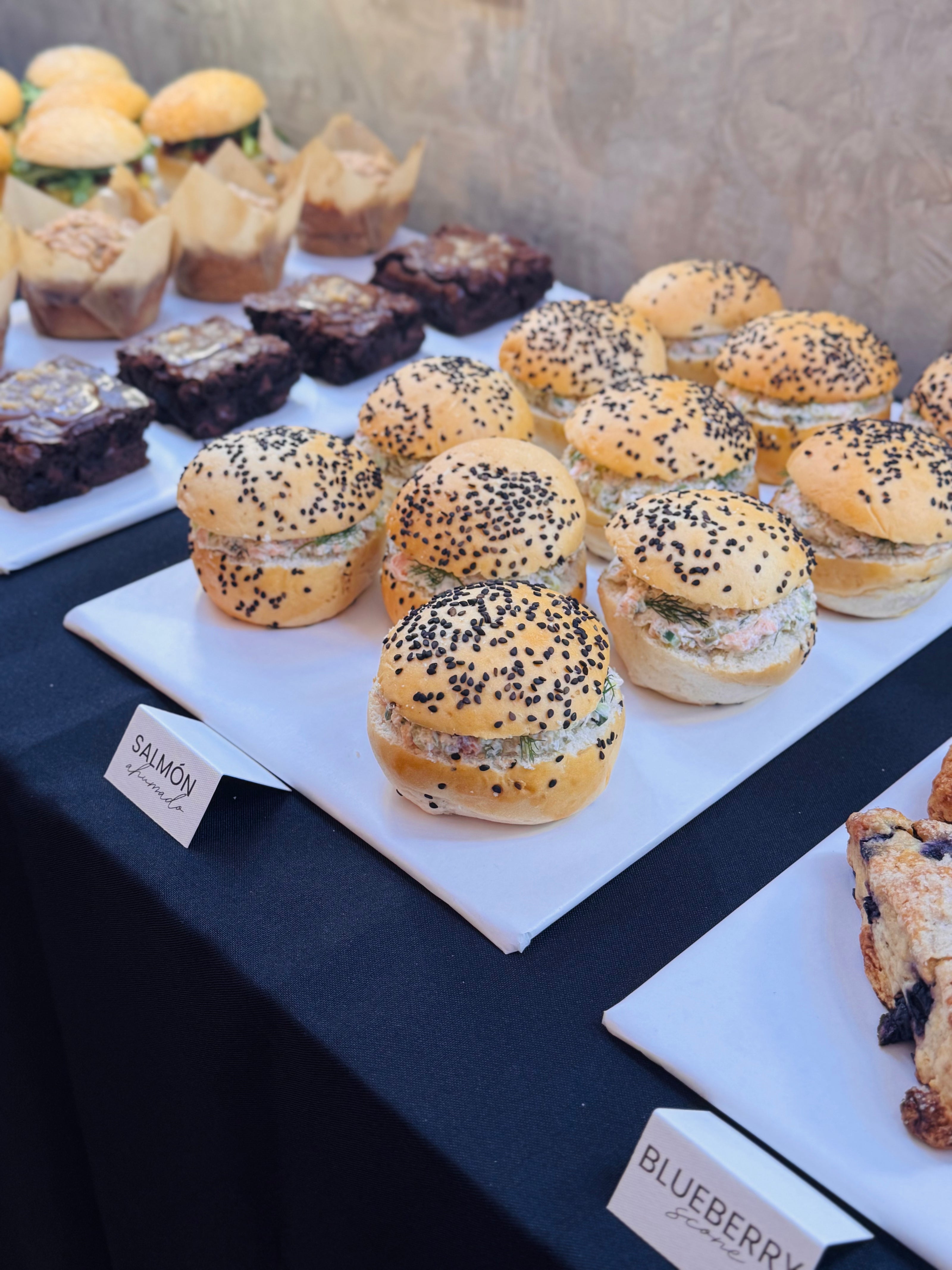 Relleno de salmón ahumado con pepino fresco, eneldo, queso crema, cebolla encurtida y lima.
