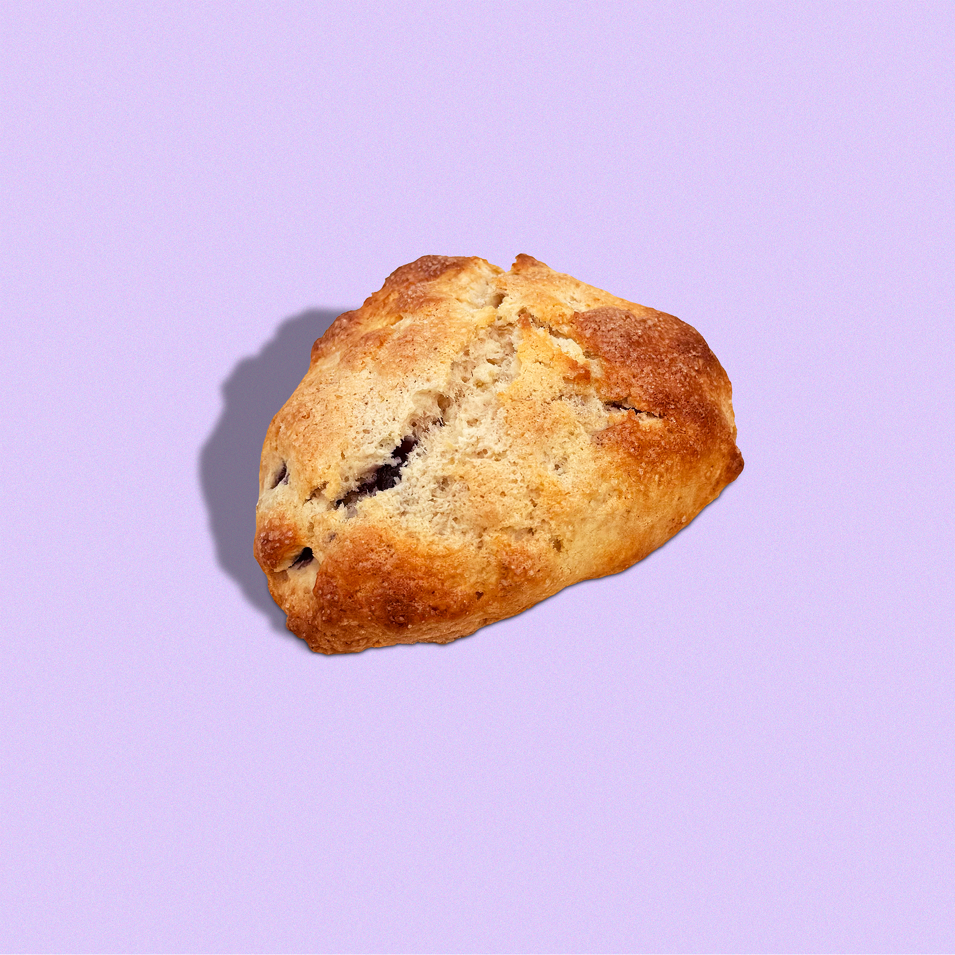 Panecito dulce suave, crujiente por fuera, con moras azules.